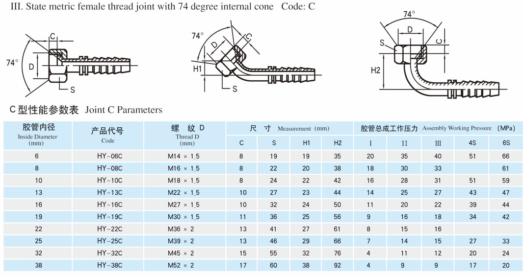 3.國標公制內(nèi)螺紋74° 內(nèi)錐面接頭 接頭代號:C型
