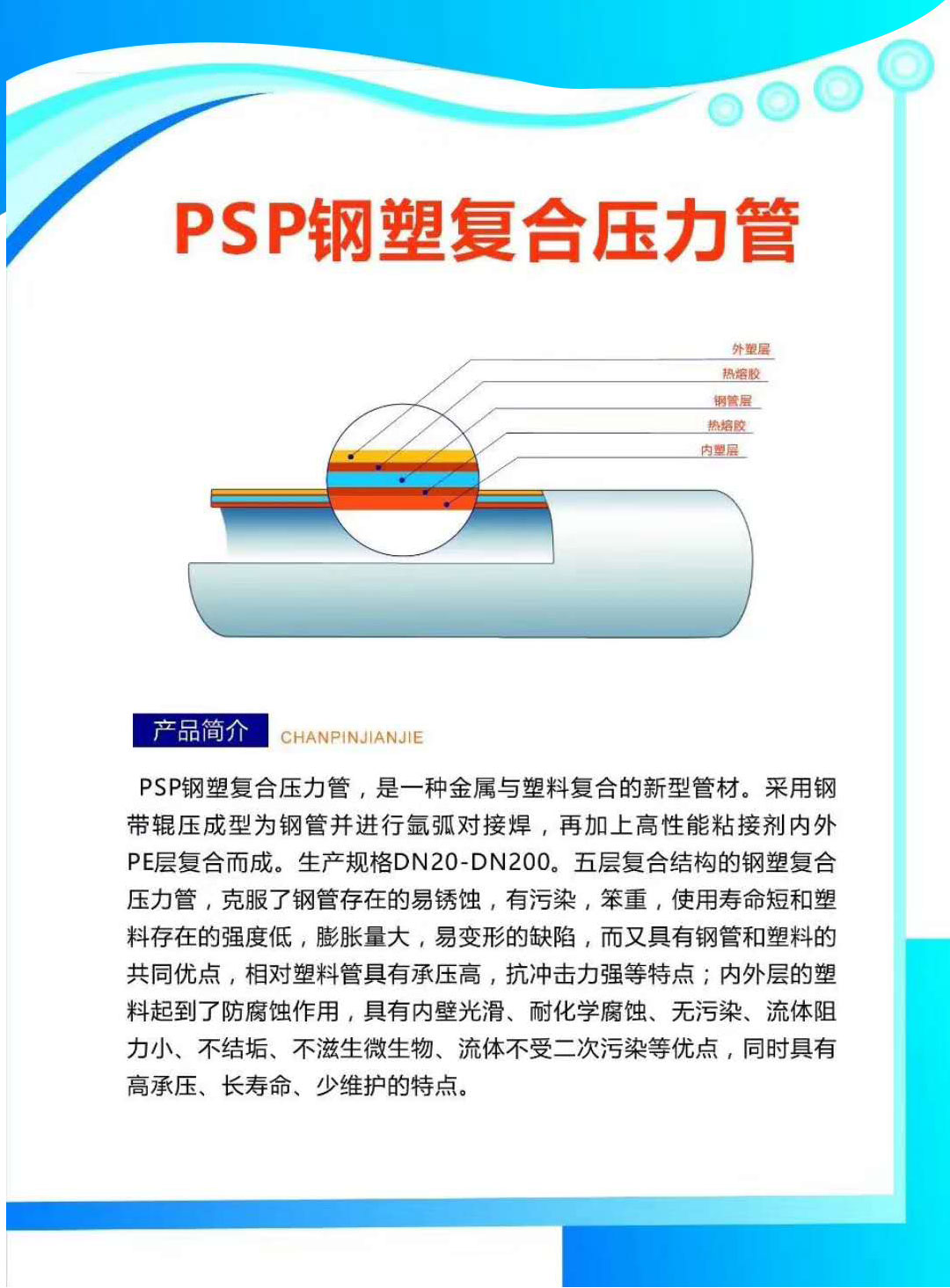 產品名稱:PSP鋼塑復合管 產品類別:工程項目系列>>PSP鋼塑復合管 咨詢電話: 022-27644893 技術參數: